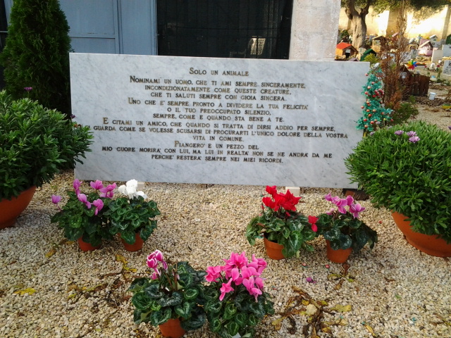 Il cimitero è nato per poter dare ai nostri piccoli e fedeli amici un posto tranquillo dove poter riposare. Noi ritireremo la salma del tuo animaletto direttamente a casa o dal veterinario e provvederemo alla sepoltura in terra o alla cremazione, così come tu deciderai. La sepoltura prevede la possibilità, sulla tomba di porre una lapide in marmo, con eventuale fotografia in ceramica e una breve frase incisa. Ci sono 4 modelli di costo differente cosi il cliente avrà più possibilità di scelta. La lastra classica, la lastra con contorno sempre in marmo, il modello a cuore e in ultimo il modello a libro. La direzione potrò come da contratto contestare e anche smontare le lapidi che non rispettano i parametri riportati sul contratto.