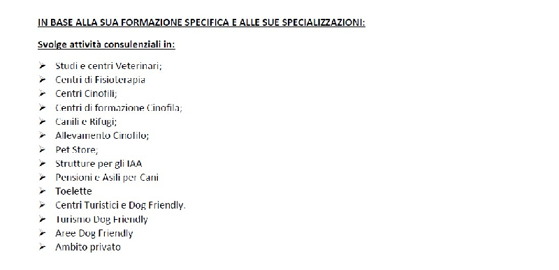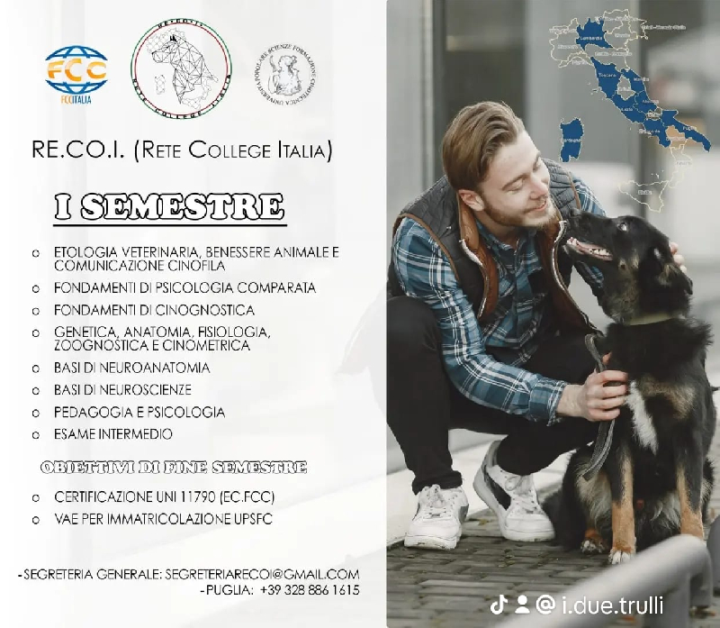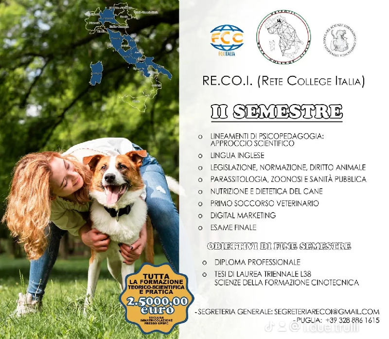 Percorso certificato, grazie all'accordo con FCC Italia e accesso diretto alla Laurea Triennale, grazie all'accordo con l'Università Popolare Scienze della Formazione Cinotecnica, per ottenere la qualifica di CONSULENTE DELLE SCIENZE CINOTECNICHE e EDUCATORE CINOFILO CERTIFICATO UNI 11790.