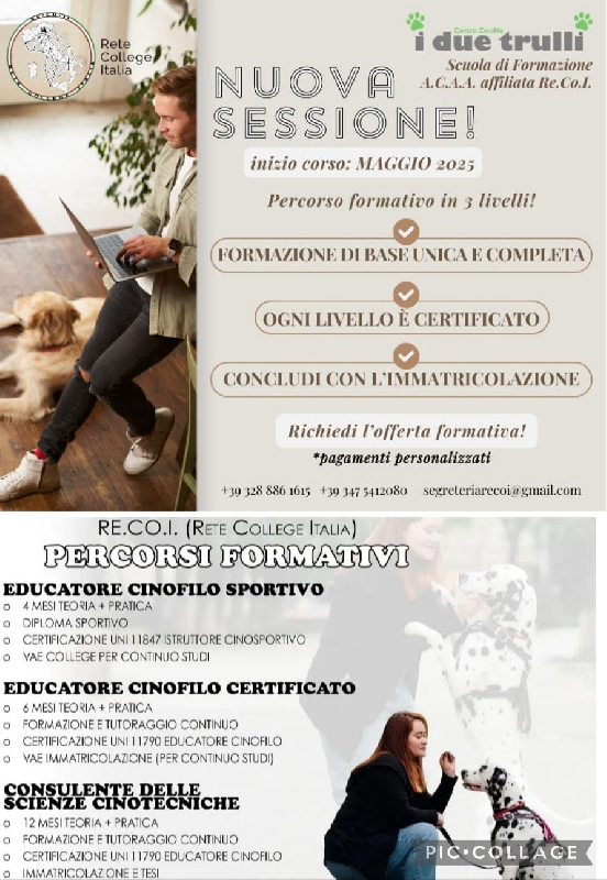 Formazione di 6 mesi per ottenere la qualifica di EDUCATORE CINOFILO CERTIFICATO UNI 11790 o formazione di 12 mesi (6 mesi+6 mesi) comprensiva di teoria scientifica in DAD e laboratori pratici in tutte le regioni d' Italia, con un unico protocollo.